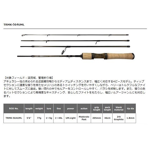 長さ:5ft6inc ウエイト:77g ルアー:1〜5g ライン:1〜4lb 継数:4ピース
