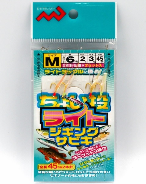 サイズ:Mサイズ:針6号(金アジ) ハリス 2号 幹糸3号 ※実物と色が違って見える場合があります。あらかじめご了承下さい。 金アジ針2本×2セットの全長45cm!!全長が短いのでショートロッドでも投げやすく、ビギナーや小さなお子様、女性にもピッタリ!! 使い方も簡単!ジグをセットして投げて巻く!!そしてトキドキしゃくる!!3gくらいから20gぐらいのジグがおすすめ!
