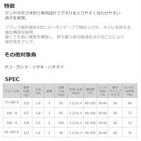 全長:1.8m 継数:2 仕舞寸法:95cm 自重:120g 先径/元径:1.1mm/11.4mm テンヤ負荷:30-60号 錘負荷:40-100号 適合クランプサイズ:SS カーボン含有率:68% ※実物と色が違って見える場合があります。あらかじめご了承下さい。