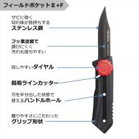 ポケットサイズの小型軽量ナイフの決定版。大好評フィールドポケットが進化して再登場。■自重約40g。ポケットサイズの小型軽量ナイフ。■刃をダイヤルスライド式で出し入れ可能。■刃がグリップ内に収納されることで、持ち運び時も安心。■刃素材:錆に強く切れ味が長持ちするステンレス製。■握りやすさにこだわったグリップ形状。■ナイロン・フロロ対応簡易ラインカッター付き。