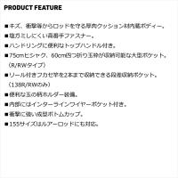 軽量、内蔵クッションがロッドを守る。●キズ、衝撃等からロッドを守る「厚肉クッション材内蔵」ボディー。●塩ガミしにくい「高番手ファスナー」 ●ハンドリングに便利なトップハンドル付き。●便利な「玉の柄ホルダー」装備。●内部にはインターラインワイヤーポケット付き。●衝撃に強い成型ボトムカップ。