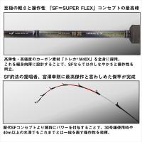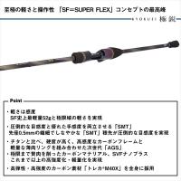 至極の軽さと操作性 「SF=SUPER FLEX」コンセプトの最高峰。多彩な極鋭カワハギシリーズ内でも特徴的な軟調子アイテムで、数々のカワハギトーナメントにおけるウイニングロッドとして輝かしい戦績を残してきた「SF=SUPER FLEX」コンセプトの最高峰モデル。「SMT」が可能にした、しなやかさによる目感度と食い込み性能、そして手感度の両立こそがSF調子の神髄。本作はこれまでのSFコンセプトを継承しながら、超低レジン高強度カーボンマテリアルSVFナノプラスを細身肉厚設計化しブランクを構築。しなやかさによるクッション性を維持しながら、もう一つ高い次元での操作性と手感度を獲得した。SF釣法の提唱者、宮澤幸則に最高傑作と言わしめた傑竿が完成。