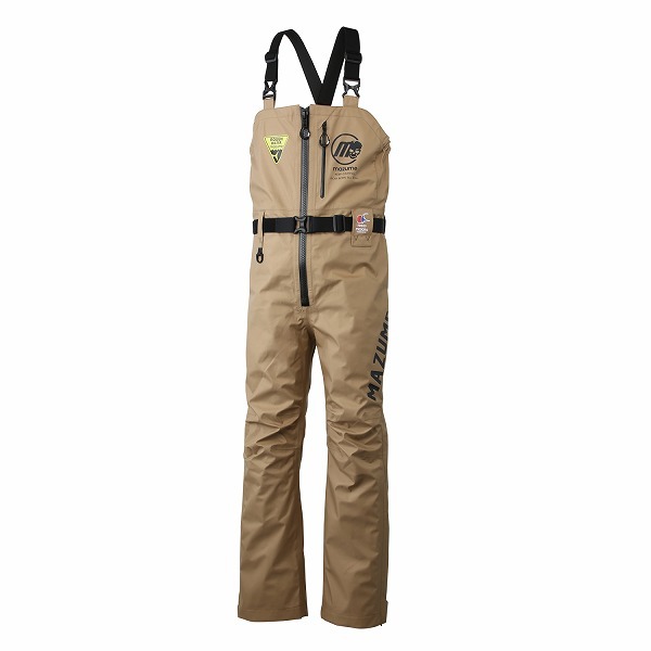 LL タン MZRP-580 ※実物と色が違って見える場合があります。あらかじめご了承下さい。 最大の特徴は4レイヤーという耐久性が非常に優れた防水・透湿生地を使ったことです。レインスーツに使われる透湿素材は3レイヤー仕様がほとんどですが、オフショアパンツIIIでは4レイヤーを採用し、とにかくタフであることを優先しています。そして、この丈夫な生地だからこそ、完全防水のYKK製アクアシールファスナーが使えるのです。着た瞬間に、オフショアフィッシングの臨戦態勢に入ることができるオフショアパンツ。ベルトループにインフレータブルウエストのベルトを通すことができ、胸ポケットにはスマホが入れられます。こうした状態で着用すれば、準備完了というわけです。プレジャーボートに乗ってひとりで出船しているときに、万が一の落水や漂流の際には、近海であれば命綱となるスマホを身に着けていれば連絡をとることができます。だから、スマホが入る胸ポケットが必要と考えます。また、ウエストベルトを締めてタイトな状態にすれば、落水の際に泳ぎやすい状態が作れます。フロントファスナーは荒れた海で船内トイレを使ってオシッコする際にとても重宝します。いちいち靴を脱いで着脱しなくても平気な、ブーツを履いたまま着脱できるブーツカット。まさに、オフショアフィッシングの戦闘服です。