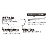 ホバスト、虫パターン等の軽量リグ対応。掛かりの良い「斜め60°アイ」ジグフック。抵抗を与え操作感を増幅させる横アイを、斜め60°に配置しゲイプ幅を稼ぐことでフッキング効率を高めた特殊形状のジグフック。タフなバスにも口を使わせる驚異のテクニック“ホバスト”においては、効果的にテールを揺らすアクションはもちろん、喰わせのキッカケとなるダートアクションやi字引きにも向いているモデル。その他、ウェイトを使用したジグヘッドの自作はもちろん、フック単体使用でのフィネスメソッドに高次元対応。●ファインワイヤー採用。●結び位置が安定する横アイタイプ。斜め60°に倒すことでフッキング効率の向上と、ややロールを抑えたアクションが特徴。●軽い力で掛け、ホールドするリマリック形状。●余計なプレッシャーを与えにくいマットブラックフィニッシュ。●キーパー等の後付け加工がしやすい、サイドロックプレス(ギザ)加工。●表面の摩擦を軽減し、貫通力を高めるシルキーFコート(フッ素メッキ加工)採用。