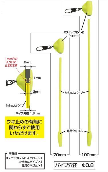 細身のロングパイプとXスナップの組み合わせで、棒ウキ使用時の糸絡みが激減 パイプには仕掛けの落ちが確認しやすい高視認性の蛍光イエローを採用 ウキ止めあり・なしいずれにも対応し、視認性に優れた蛍光イエローのXスナップ付属 別売のワンタッチメタルが取付可能 ※実物と色が違って見える場合があります。あらかじめご了承下さい。 棒ウキ使用時の糸絡みが激減する、新発想の絡み防止パイプ!