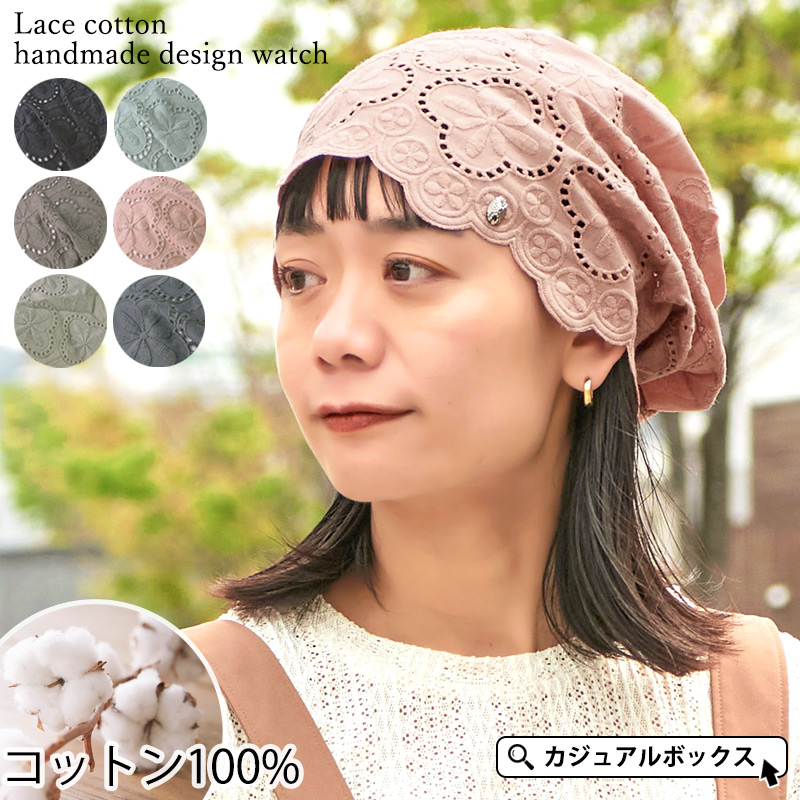 帽子 ニット帽 ニットキャップ ワッチキャップ 医療用帽子 ケア帽子 室内帽子 レディース 綿100% 春夏 夏用 | レースコットン ハンドメイド デザイン ワッチ