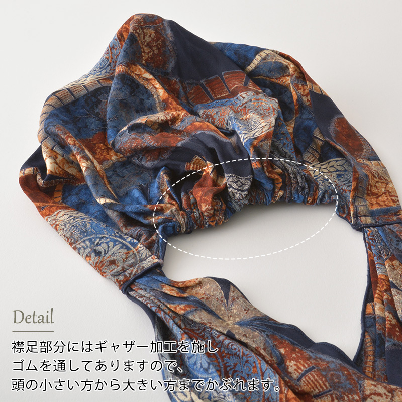 襟足部分にはギャザー加工を施しゴムを通してありますので、頭の小さい方から大きい方まで性別・年代問わずにかぶれます。