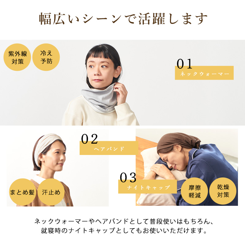 ネックウォーマー、ヘアバンド、ナイトキャップなど多用途に使え、洗濯機で手軽に清潔を保てます。