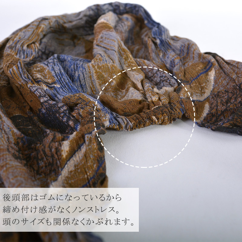 ただかぶって後ろでくくるだけですので本当に簡単でお洒落なアイテムです。