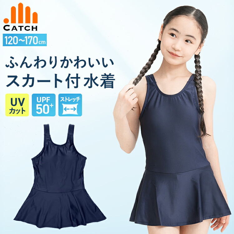 スクール水着 女子 スカート付き ワンピース UPF50 紫外線 UV対策 小学生 中学生 子供 キッズ 体育 女の子 スク水 水泳 紺 ネイビー 送料無料