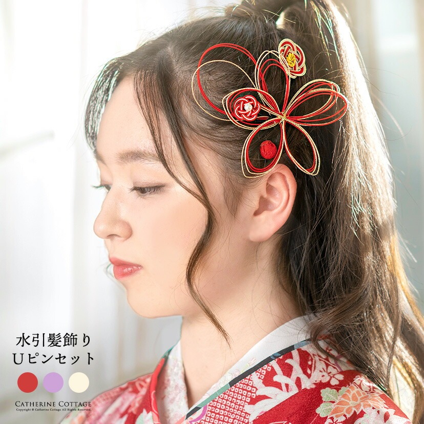 | 商品紹介 | 福を呼び込む水引ヘア! 雅やかなニュアンスをプラスして 日本伝統の縁起物、水引。 和装スタイル時の髪飾りとして今注目が集まっている水引を、 ヘアアレンジに使いやすいようUピンのセットにしました。 そのしなやかで繊細な水引の曲線で、 ヘアアレンジに風雅な動きと華やかさをプラス。 造花の髪飾りなどと合わせて使えば、 より一層立体感のあるゴージャスなヘアスタイルに。 卒業式袴スタイルや成人式振袖、 お正月などお着物着用時の和装ヘアアレンジに。 |