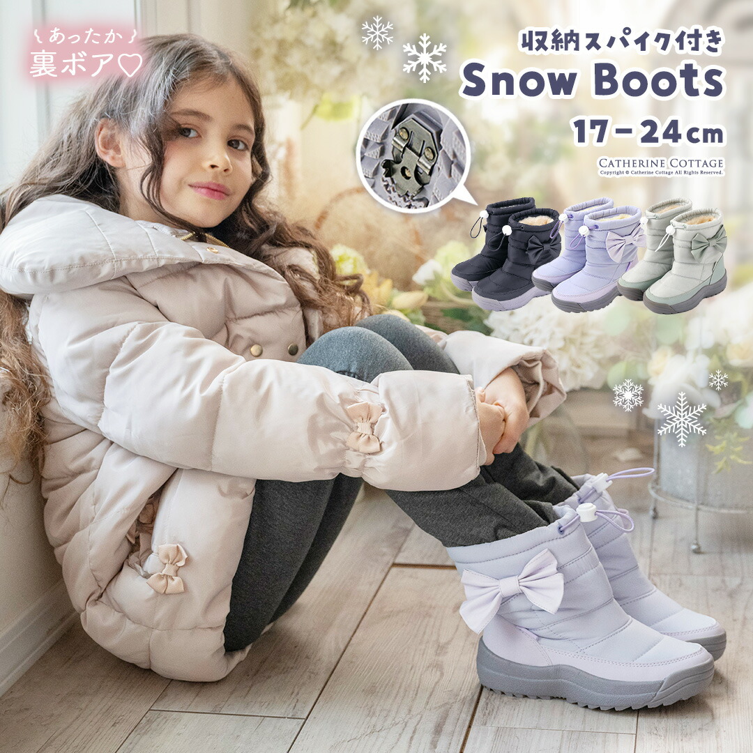 | 商品紹介 | 滑り止め機能アップ! 雪の日の、心強くもかわいい味方! キッズ女の子の足元をかわいく彩るスノーブーツです。 かわいい、だけじゃない、 アウトソールには収納式スパイクを秘めた実力者! かわいいルックスと機能性を兼ね備えた一足は、 雨の日から雪が降り積もるシーンまで、 女の子の足元をおしゃれにあたたかく守ります。 冬のデイリーな通園通学に。寒い日のお出かけに。 雨や雪の日に。冬のアウトドアシーンに。 POINT ●収納式スパイク付きアウトソールで、滑りにくい! -グリップ性の高いゴツゴツした靴底に、さらに収納式スパイクをオン! -出し入れできるから、シーンに合わせて使い分けて ●軽量で足さばきも軽やか! -しっかりとしたすべり止め機能をもちながらも、軽量を実現 ●ボアでやさしくあったか! -とくに履き口まわりにはボア素材を配置。やさしくフィット&あたたか ●取り外せるインソール -仮に濡れてしまっても乾かしやすく、清潔に保てます ●おしゃれなデザイン! -サイドリボンに、ワンポイントアクセントのキャサリンタグもおしゃれ | |||||||||||||||||||||||||||||||||||||||||||||