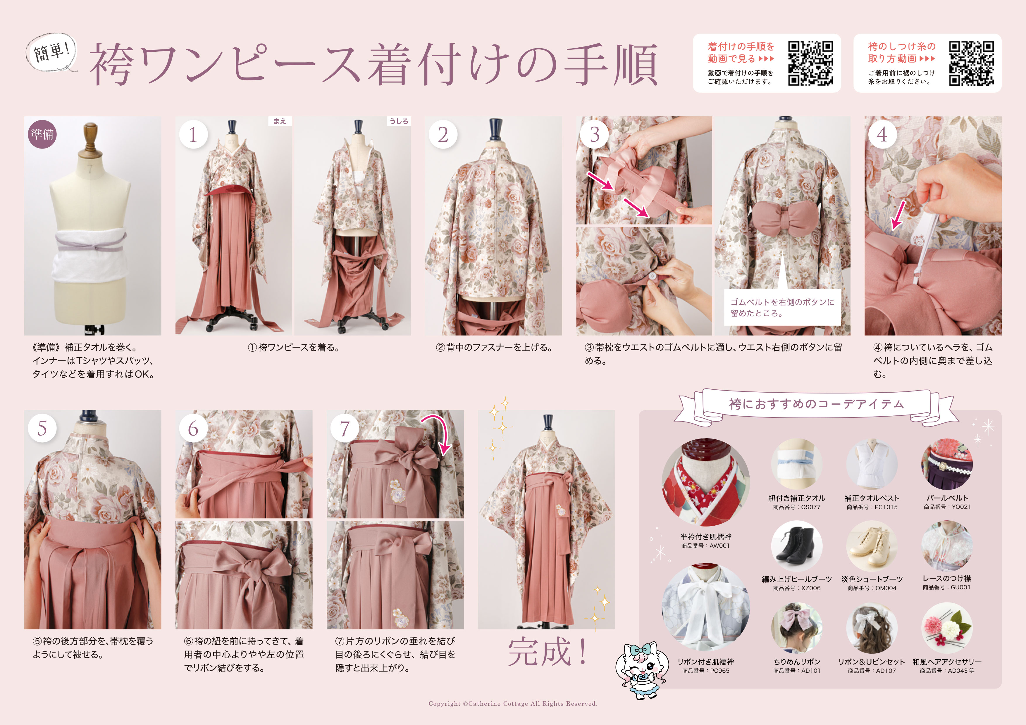 | 商品紹介 | 織柄入り花柄生地で高見えも欲張って 3ステップで簡単! 袴一体型着物ワンピース ワンピースを着る感覚で完璧な袴スタイルが叶う簡単着付けを極めた袴セットに、高見えがする織柄入り花柄生地バージョンが登場しました。 特別なアイテムも着付けの知識さえも不要、パーツはすべて一体型となった大胆構造で、簡単、楽々でも見事な見映えをお約束! POINT ・3ステップで袴スタイルが完成! -たったの”3ステップ”で憧れの袴スタイルが叶う! ・コツいらずで完璧な見映え! -袴切り替え部分はウエストより少し高め、胸元に近い位置にくるのがベスト -前面は袴スカートが着物に縫い留めてあり位置が決まっているので、サッと着るだけで袴スタイルの黄金比率で着こなせます。 ・オールインワンだから着崩れにくい! 襦袢を下に着ているように見える襟元は縫い留めてあるからはだける心配もなく、着物と袴スカートも前面は縫ってあるため、着崩れにくいつくりとなっています。 ※背面は縫い留めていないため、椅子に座るさいは袴を少し持ち上げて座るようお子さんに教えてあげてください |