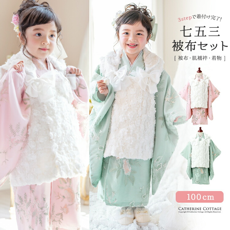 | 商品紹介 | 3才七五三をロマンティックに演出! 刺繍入りチュール着物とバラ生地被布セット 優美な花柄刺繍をあしらったチュールレース着物に、立体感が愛らしいバラ生地の被布を合わせた 3才七五三女の子の和装スタイル。 被布についたおリボンも、かわいらしさと気分を盛りあげます。 お着物は面倒な腰上げ不要、身長100cmのお子さんが着てちょうどよい丈に縫い留めてあるから、ご自宅で簡単に着せてあげられる仕様。 着付けの知識や道具がなくても、一度きりの3才七五三のお子さんの晴れ姿をかわいく残せます。 また、同じ生地を使った着物の袴セット(商品番号:HAKAST14)もあるから、 7歳と3歳、姉妹で七五三のお祝いを迎えるご家庭なら和装の姉妹おそろいコーデも可能です。 |