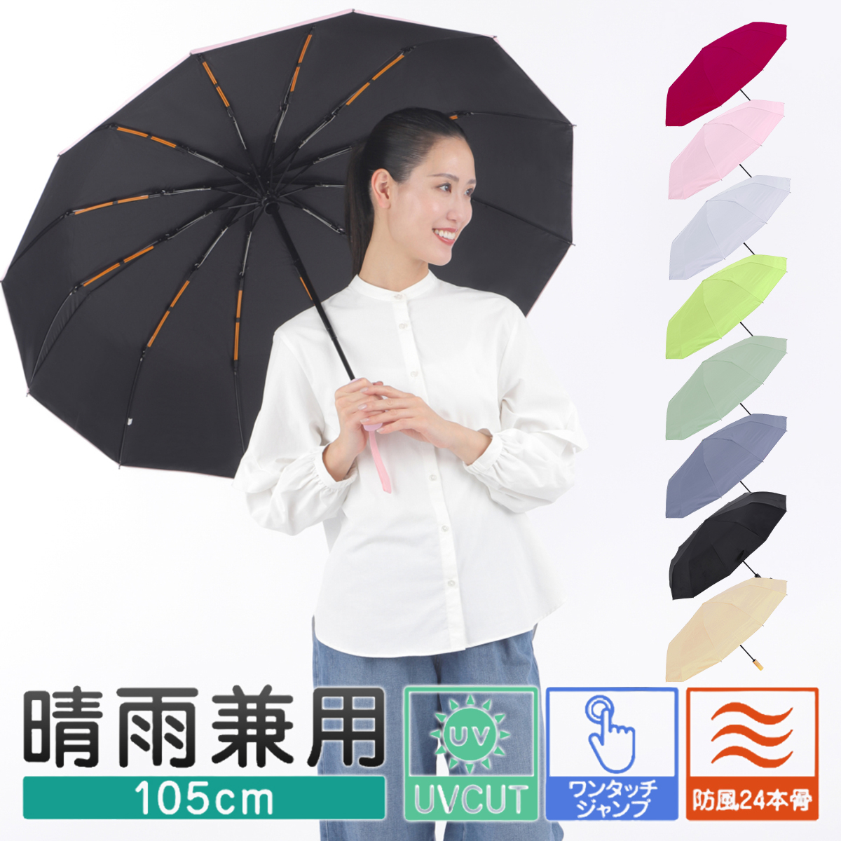 晴雨兼用で高い遮光性も兼ね備えており、日傘としても利用可。