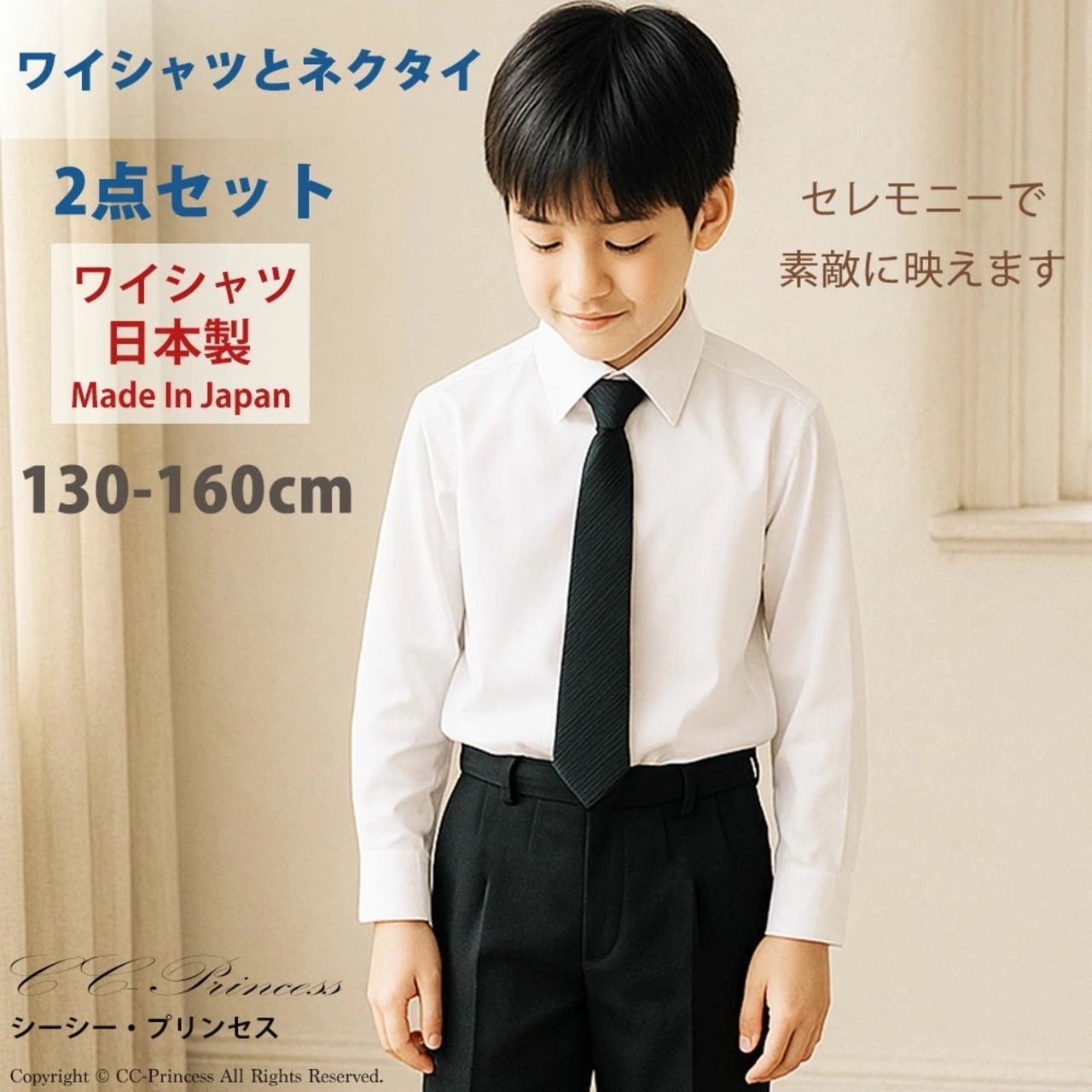 ・どのような場面でもご使用いただける、 「子供用・白の長袖ワイシャツ」と「黒のネクタイ」の2点セットです。
