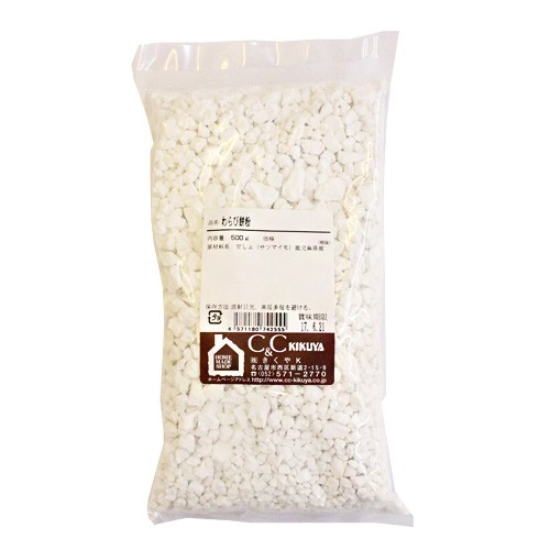 甘藷でん粉をさらして、あくをぬいたもの。砂糖と合わせて、水でたくと簡単にわらびもちができます。【※この製品は、小麦・乳・卵・そば・大豆・落花生、えび、かになどアレルギー物質を含む製品と同じ工場内で小分け製造しています。】