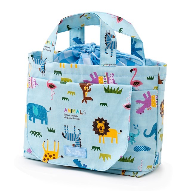 おむつポーチ・M (巾着トートタイプ) サバンナ横断どうぶつ大行進(ライトブルー)