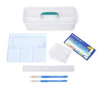セット内容:画材・絵の具バッグ(ショルダーベルト付)、マット水彩12色ラミネートチューブ入(5ml)、パレット15色用、角型筆洗 E(大型)、筆拭きぞうきん、画筆ネオセブ ロン丸型(細・太)、筆筒