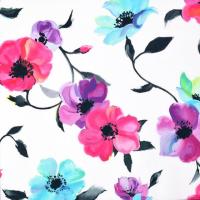 白いキャンバスへ絵筆をすべらすように描かれたアネモネの花と、豊かに伸びゆく葉や茎。紅紫や桔梗色、水色など繊細に移り変わる花の色に墨色が大胆な配色です。
