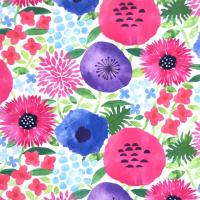 絵の具で描かれたようなカラフルで愛らしい花が生地いっぱいに広がり、まるでお花畑のよう。全体的にメリハリのある大胆な色彩も斬新です。