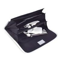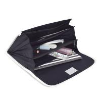 本体は、レザー調のパイピングで上質な仕上がりとしっかりとした作りになっています。他にも、貴重品を収納できるファスナー付きポケットやカードポケット・ペンホルダー・中身が見えるメッシュポケットなど、小分けに便利なポケットが満載です。