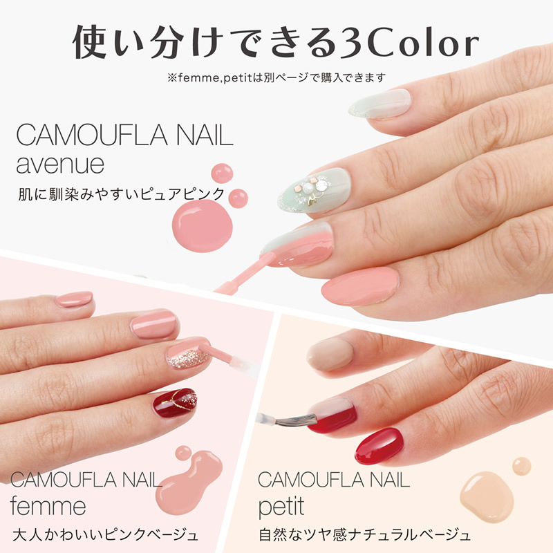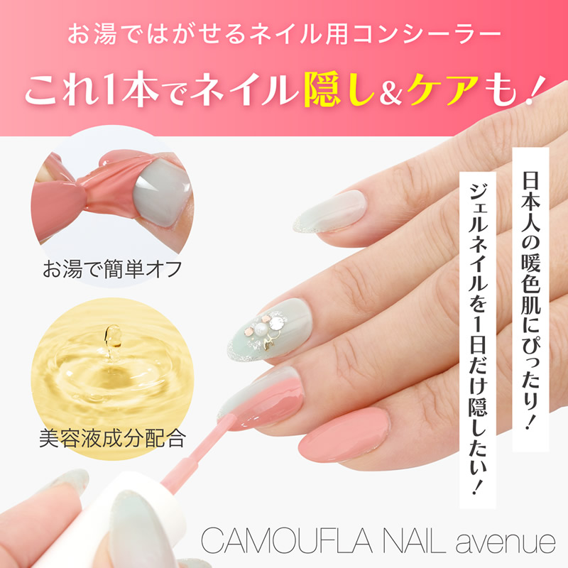 学校や職場だと派手目なネイルはNG、だけどちょっとおしゃれもしたい、爪が荒れてネイルよりケアをしなくちゃ、そんな方にぴったりのナチュラルにプチおしゃれができて、ネイルケアも同時にできるのが「カモフラネイルavenue」です!