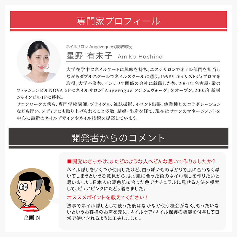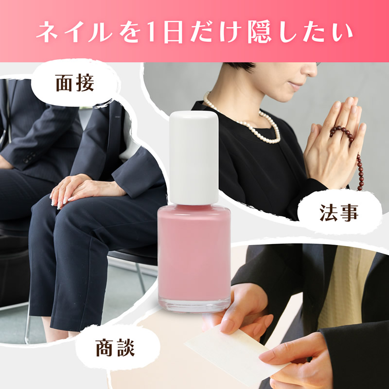また、日頃からおしゃれなネイルをされている方も、急なお通夜や面談などの急なフォーマルな場面で1日だけネイルを隠したい時にもデコネイル等の上に重ね塗りすることで、ネイル隠しとしても使用できます。