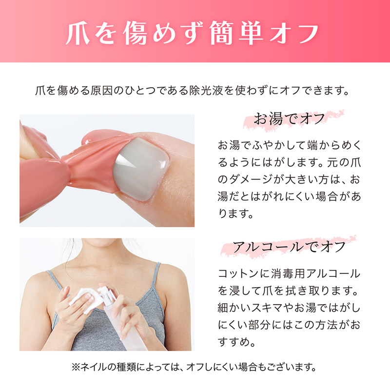 ●お湯またはアルコールで、元のネイルを傷めることなくきれいにはがせる