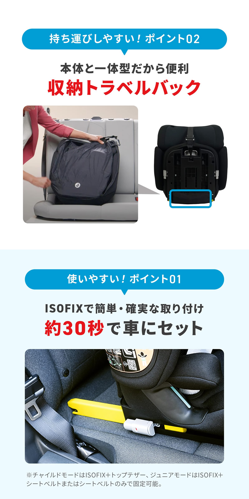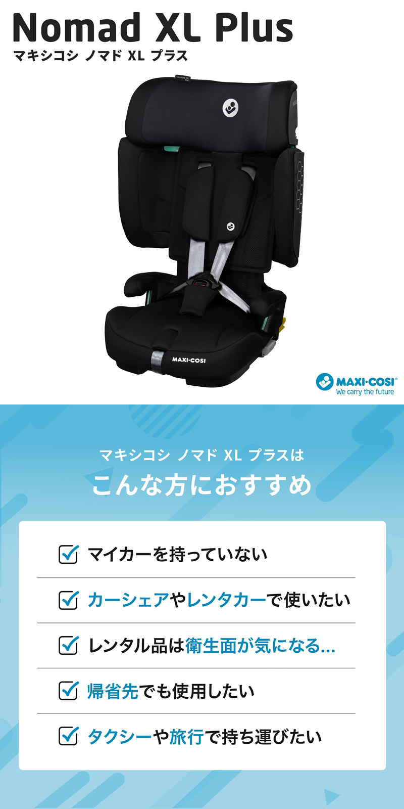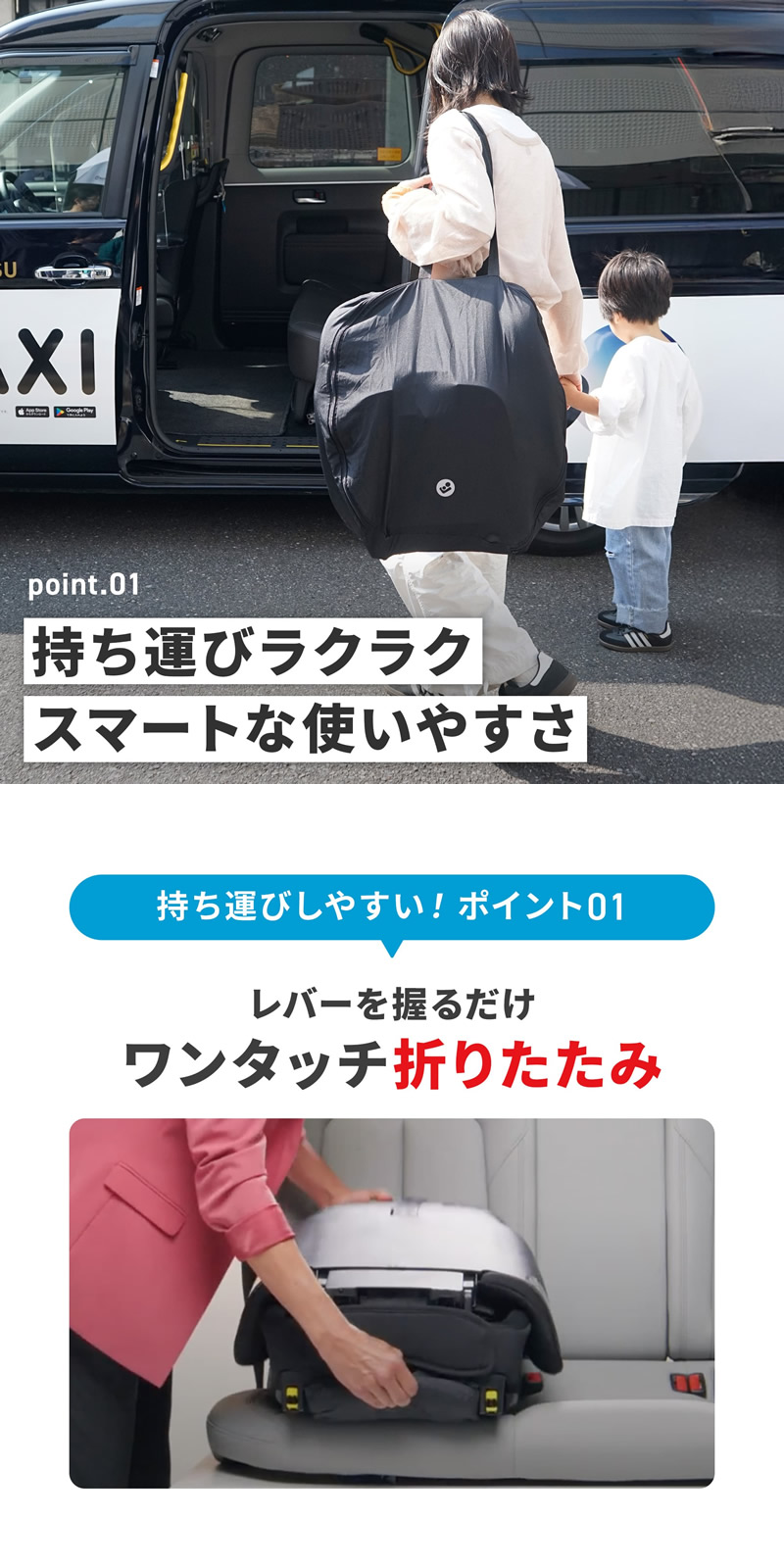 普段のドライブからタクシー・帰省・レンタカーやカーシェア利用まで幅広いシーンで活躍する、折りたためて持ち運べるチャイルドシート。
