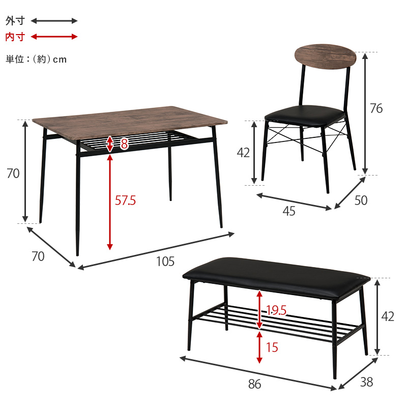 テーブル:(約)幅105×奥行70×高さ70cmチェアー:(約)幅45×奥行50×高さ76×座面高42cmベンチ:(約)幅86×奥行38×高さ42cm