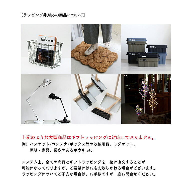 | CDCのギフトラッピングは包装紙からこだわったオリジナルデザイン。絵本の世界から飛び出したような可愛らしいイラストを散りばめました。 モノトーンのシンプルな配色にポイントで赤を利かせた、どんな方が受け取ってもわくわくするようなラッピングです。 ![]() 【ギフトラッピング内容】385円(税込) 包装紙でのお包み+ペーパーラフィア(赤or黒)+ショップカード(赤と黒のリバーシブル)+紙袋 【注意事項】 ・クリスマス等、ギフトのご注文が集中する時期は、通常よりもお届けにお時間を頂く場合がございます。 ギフトにお選び頂く際は、お渡しの予定日から余裕を持ってご注文下さい。 ・お届け日のご希望がある場合は、必ず「配送日時」のご指定をお願いします。 ・大型商品はラッピングに対応しておりません。 例)バスケット/コンテナ/ボックス等の収納用品、ラグマット、照明・家具、長さのあるホウキ etc システム上、すべての商品とギフトラッピングを一緒に注文することが可能になっておりますが、ご要望にはお応え致しかねる場合がございます。 ラッピングについてご不安な場合は、お手数ですが一度お問合せください。 【ご注文方法】 1)ラッピングの数量を『ご希望の包みの数』ご注文下さい。 2)ラッピングを希望する『商品名』『点数』を注文備考欄にご記入ください。 まとめてのラッピングをご希望の場合はその旨をご記入ください。 ※メーカー箱が付いている商品は箱の上から包装紙でお包みします。 ※メーカー箱のない商品は、商品の上からそのままお包みする場合がございます。 ※大きな商品は全体をクラフト紙でお包みし、包装紙を帯状に掛けた仕上がりとなります。 ※ギフトラッピングの仕様や内容は予告なく変更する場合がございます。 ※商品の形状や組合せにより、それぞれ最適な形でお包み致します。イメージ写真と仕上がりが異なる場合があることをご了承ください。 ![]() ![]() ![]()