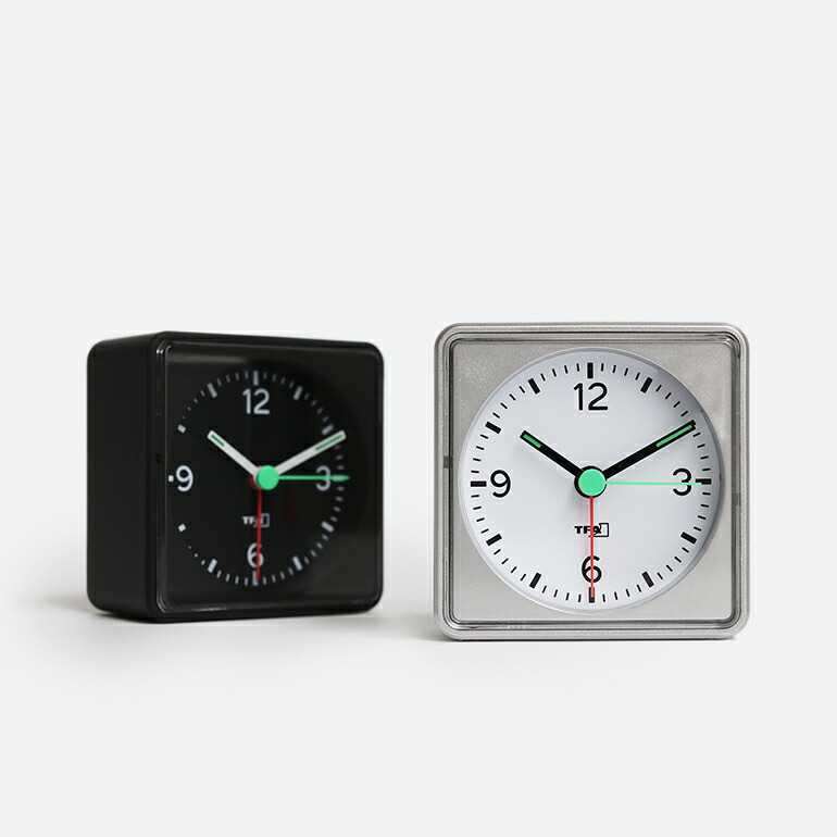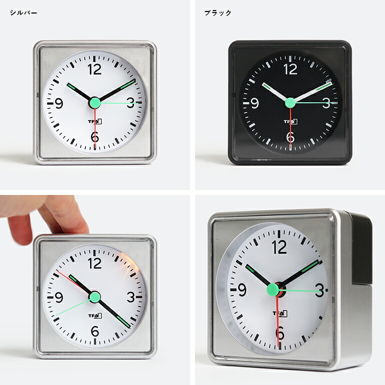 50年以上に渡り世界中で愛されてきた、TFA Dostmann社の高品質なアナログ目覚まし時計。 洗練されたデザインと確かな機能性を兼ね備えています。 ブラックとシルバーの2色展開で、どちらもモダンなインテリアにすっと馴染んでくれます。 視認性に優れた大きな文字盤を採用しており、時間を一目で確認することができます。 また、秒針にはスイープムーブメントが採用されており、カチカチという動作音がなく、静かな環境でも快適に使用できます。 アラーム機能も搭載されており、聞き取りやすい電子音で確実に目覚めをサポートしてくれます。 さらに、上部のボタンにはライト機能とスヌーズ機能が備わっており、暗い場所でも文字盤を照らして時刻を確認できるほか、アラームを一時停止し、数分後に再び鳴らすことも可能です。 本体はコンパクトで軽量な設計となっており、旅行や出張など、持ち運びが必要な場面にも最適です。