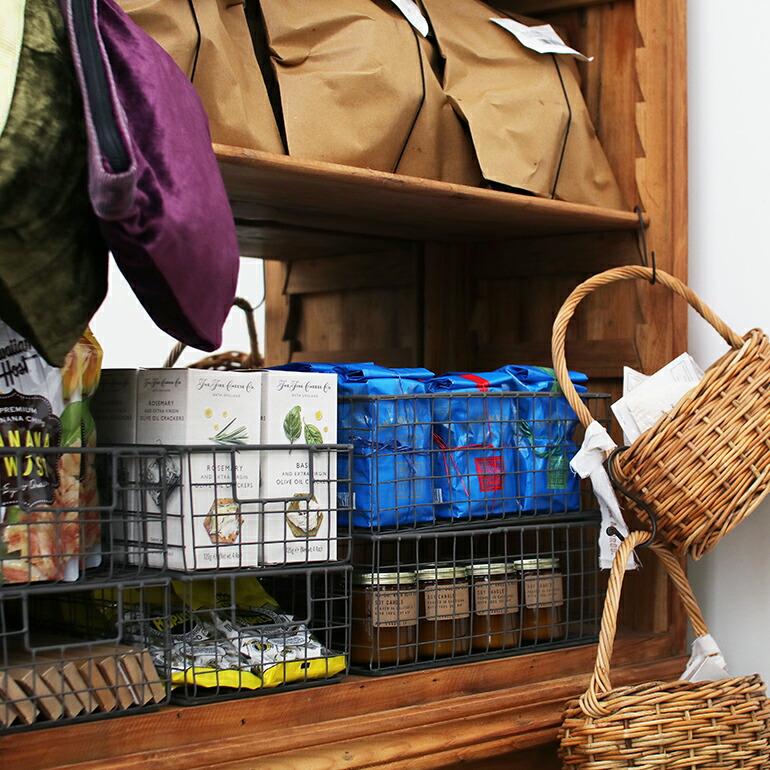 店舗での商品ディスプレイにスタッキングでき、中身の見えるワイヤー製のボックスは店舗ディスプレイに最適です。