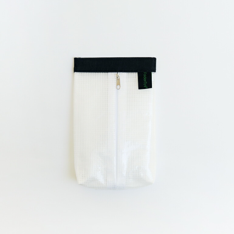 ドイツのステーショナリーブランド“FolderSys”(フォルダーシス)社製のスナップバッグポーチ。 “FolderSys”は、PVCフリー素材やリサイクル素材を積極的に採用。 カーボンニュートラルな配送に努めているなど、ウエルネスと環境に配慮した製品を作っているブランドです。 こちらのポーチは、EVA(エチレン酢酸ビニル)素材を採用。 軽量かつ耐久性に優れた素材で、環境にやさしくリサイクルもできる新素材。 開口部はばね口になっているので、片手でパカっと開けられるのもうれしいポーチです。 表にはファスナー付きポケットを備えており、細々とした物の整理用にも便利。 内側にはゴムのループ付きで、キーリングを取り付けて使うのもおすすめですよ。 大きさは、【A7】【A6】の2サイズ展開。 こちらの大きめの【A6サイズ】は、ペンなどもしっかりと収まる大きさ。 ペンケース代わりに使ったり、PC周りの小物の持ち運び用にも重宝します。 また、水濡れに強いため、コスメポーチにもぴったりです。 外から中身が程よく透けるので、視認性がありながらもすっきりとした印象。 高い実用性を保ちながらスタイリッシュに持てるデザインもなのもうれしいですね。