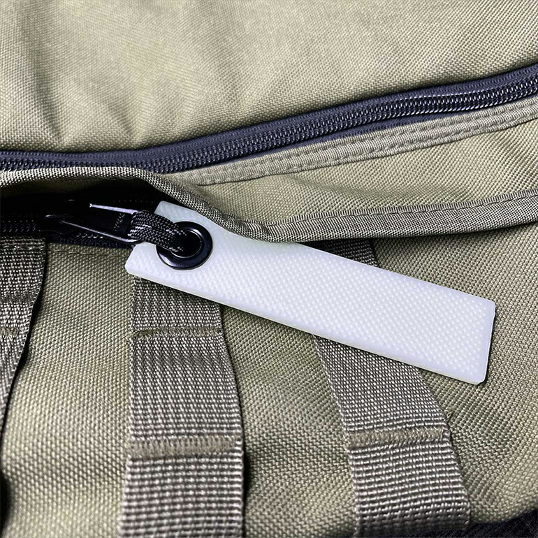 暗い場所でも素早く認識できる、蓄光式のタグ。 キーリングやジップに付けることで目印となってくれ、日常の様々なシーンで大活躍してくれるアイテムです。 太陽光をはじめ、スマートフォンのライトや懐中電灯など、あらゆる光源から蓄光することが可能。 暗くなると自然と発光し、電池不要で使えるのもポイントです。 最大24時間発光し続け、一般的に流通している蓄光材に比べて驚くほど明るく、発光時間も約2倍ほどの高性能。 アメリカの政府機関と取引を行うために必要なCAGE CODEを取得したアメリカ企業にて製作されています。 こちらは SAR(捜索救助部隊)からのギアやジッパーに付けられるパーツの要望により開発されたもので、その優れた機能性はお墨付き。 キーリングの目印にはもちろんのこと、バッグのジップやアウトドアギアに取り付けておくのもおすすめの使い方。 暗い状況下での視認性が格段に向上し、大変便利です。 大きめサイズなので、名前をペンで書き込んでネームタグとしてもお使いいただけますよ。