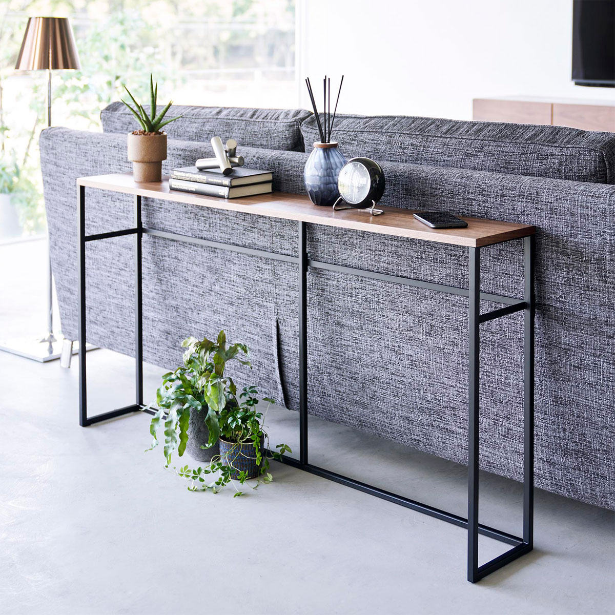 tower ソファー裏コンソールテーブルは、美しさと機能の調和が魅力です。スリムでワイドなデザインがデッドスペースを魅力的なスペースに変え、フック付きでブラシなどを便利に収納。本やオブジェ、フレグランス、植物など、お好みの小物を飾り、リビングやダイニングを素敵に演出します。