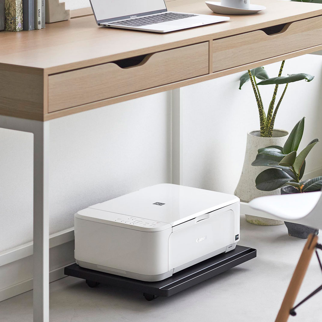 使う時だけ引き出せる便利なキャスター付きのプリンターラックです。使わない時はデスク下にすっきり収納でき、A4プリンターにピッタリのシンプルなラックとして最適です。キャスター付きなので、移動もスムーズで、加湿器の収納にも便利です。