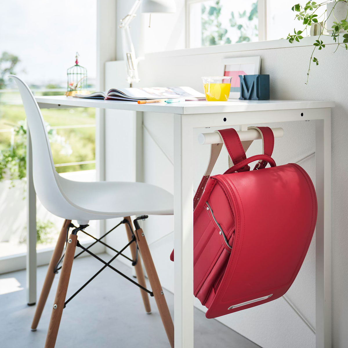 デスクやキッチンカウンターの天板下や壁面に、木ネジでしっかりと取り付けできる便利なランドセル&リュック収納ハンガーです。キッチンカウンター天板の下に取り付ければ子供の宿題を見ながら家事ができて便利です。