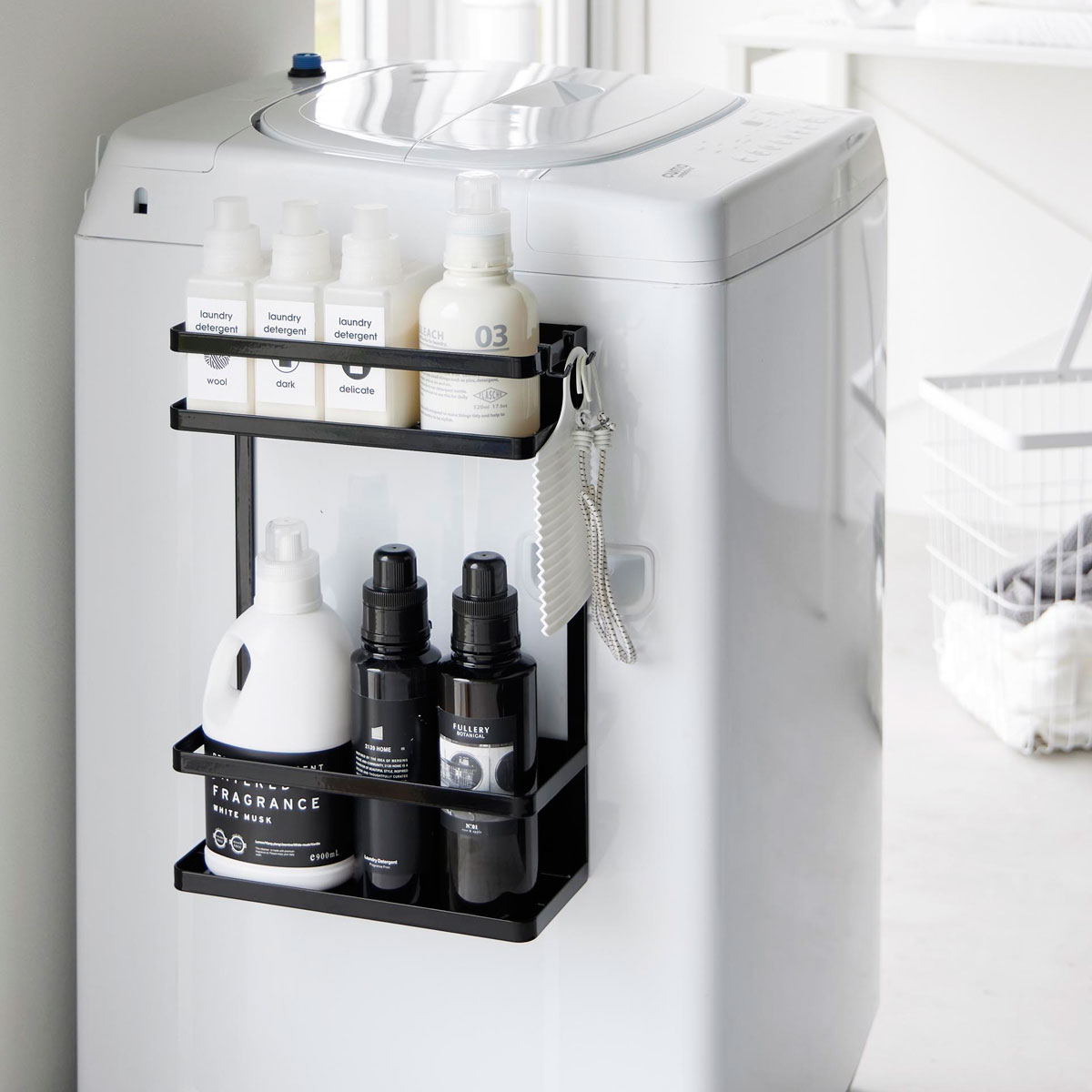マグネットで洗濯機の側面に簡単設置の、タワー 洗濯機横マグネット収納ラック。下段には大容量の詰め替えやストックも置くことができる便利な収納ラックです。