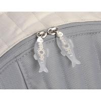ショルダーストラップは、着脱が可能で、1本がけもできます。アジャスターで長さ調節も可能です。尾びれと潮噴きのタグが付いて、ファスナーチャームは透明のお魚になっています。