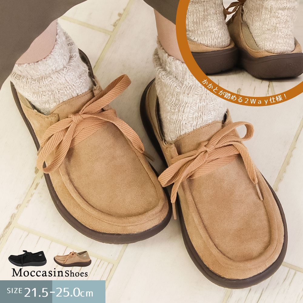 モカシンシューズ レディース チロリアンシューズ 2way かかとが踏める クロッグシューズ カジュアル サボ 軽い 黒 ブラック ベージュ 2520
