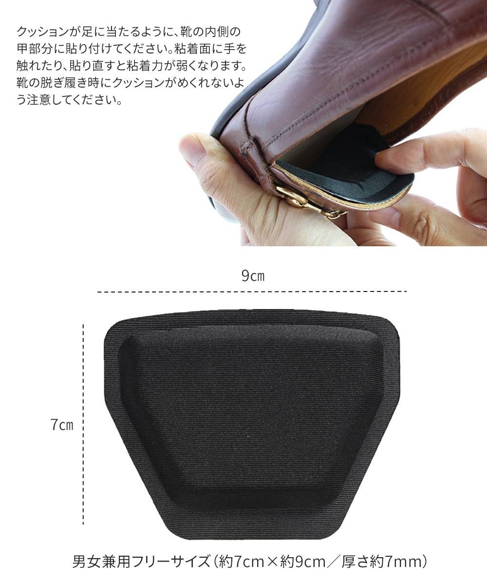 ・クッションが足に当たるように、靴の内側の甲部分に貼り付けてください