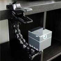 直径0.6cm〜5cmまでのパイプやテーブルなどに固定可能な強力スプリングのクリップにより、棚板や縦板、ラックのパイプ、テーブルのフチなど、はさめる場所ならどこにでもモバイルプロジェクターを設置可能。