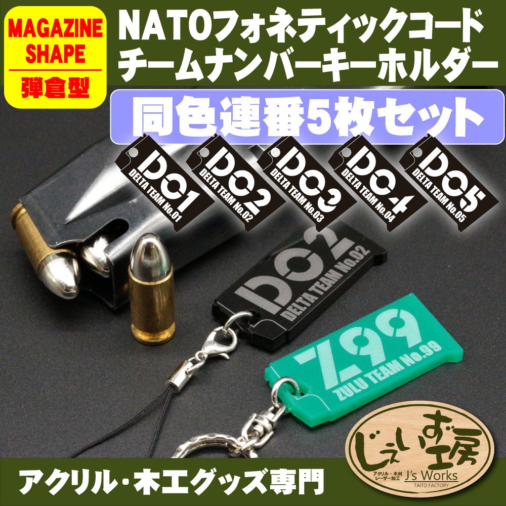 同色連番5枚セット 弾倉(マガジン)型 フォネティックコード ストラップ キーホルダー 名札 オーダーメイド レーザー刻印
