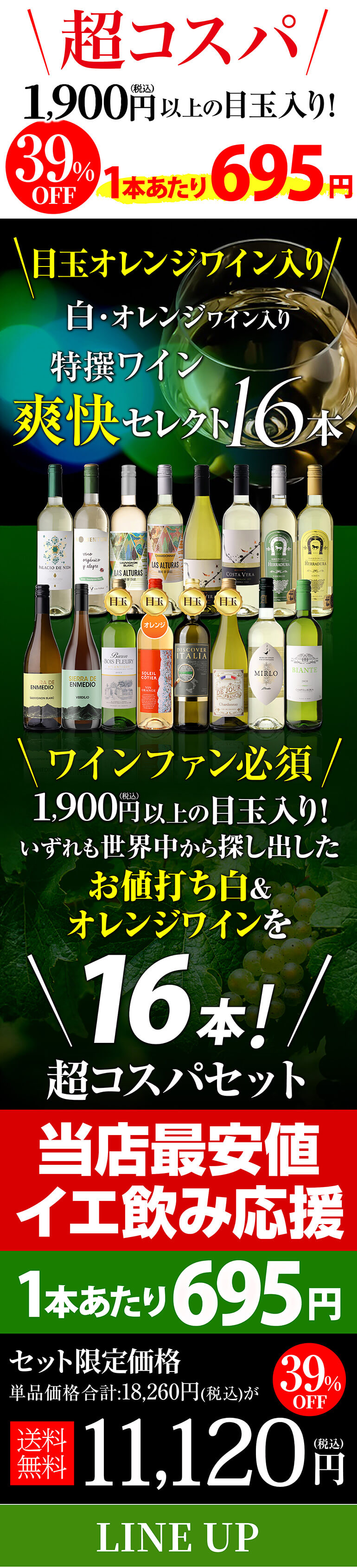 ワイン ワインセット 白セット 1本あたり695円(税込) 送料無料 目玉オレンジワイン 白爽快16本セット 36弾 白 飲み比べ 辛口 オレンジ 浜運A