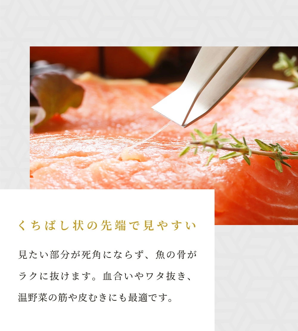 ■小林製作所の一番の魅力は、高い研磨技術による滑らかな刃先とスッと抜くことができる独自設計です。料亭の職人様にもご愛用いただいているプロも納得の使いやすさ、骨血合いやワタ抜き、温野菜の筋や皮むきにも重宝されています。