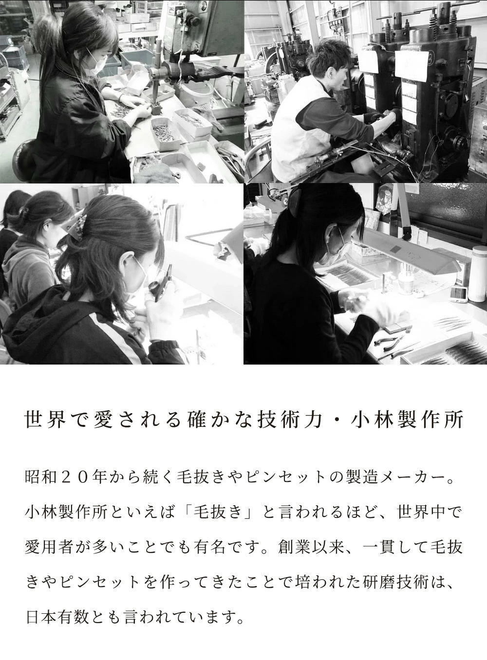 HUNTERは小林製作所とバースバンクがコラボレーションしたオリジナルブランドです。小林製作所は、昭和20年から続く毛抜きやピンセットの製造メーカー。小林製作所と言えば「毛抜き」と言われるほど、世界中で愛用者が多いことでも有名です。創業以来、一貫して毛抜きやピンセットを作ってきたことで培われた研磨技術は、日本有数とも言われています。