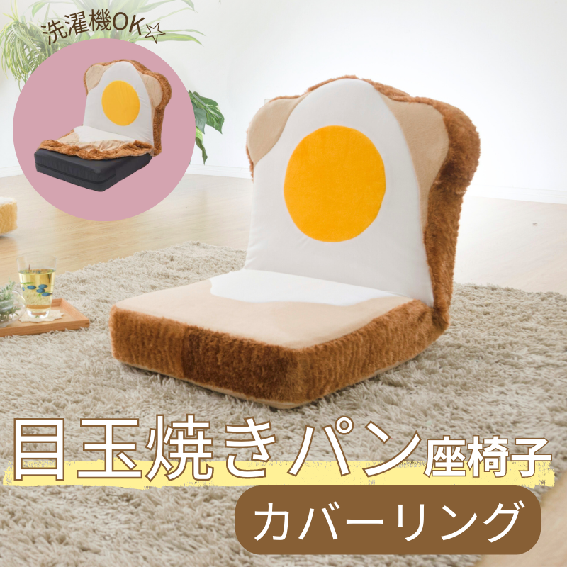 スタッフのおすすめポイント 目玉焼きをのせたかわいい食パン座椅子です。すべすべカバーは取り外して洗濯可能、背もたれ5段階リクライニング。座面は低反発ウレタン仕様で、座り心地抜群。別売りの単品カバーもご用意しているので、洗い替えや気分を変えたいときにぜひ。