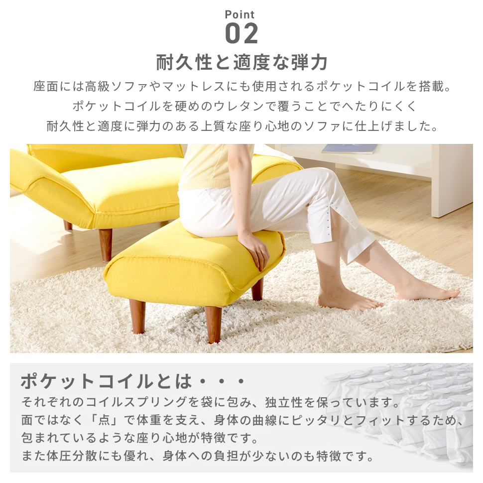 ポケットコイル搭載で上質な座り心地ですので、愛用のソファに合わせても、ちょっとしたスツール代わりとしても、便利にお使いいただけるオットマンです。